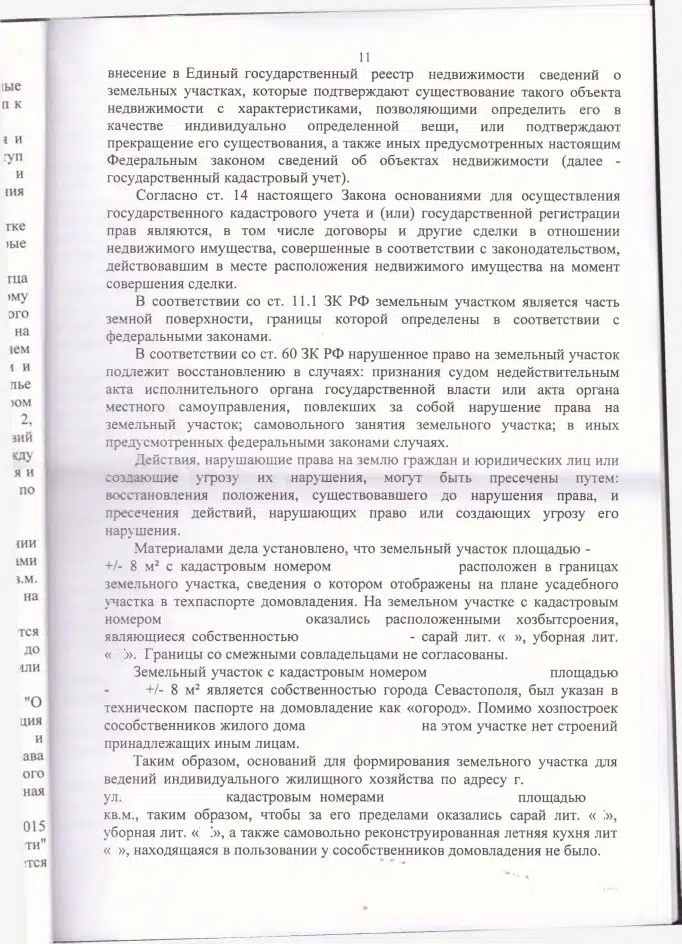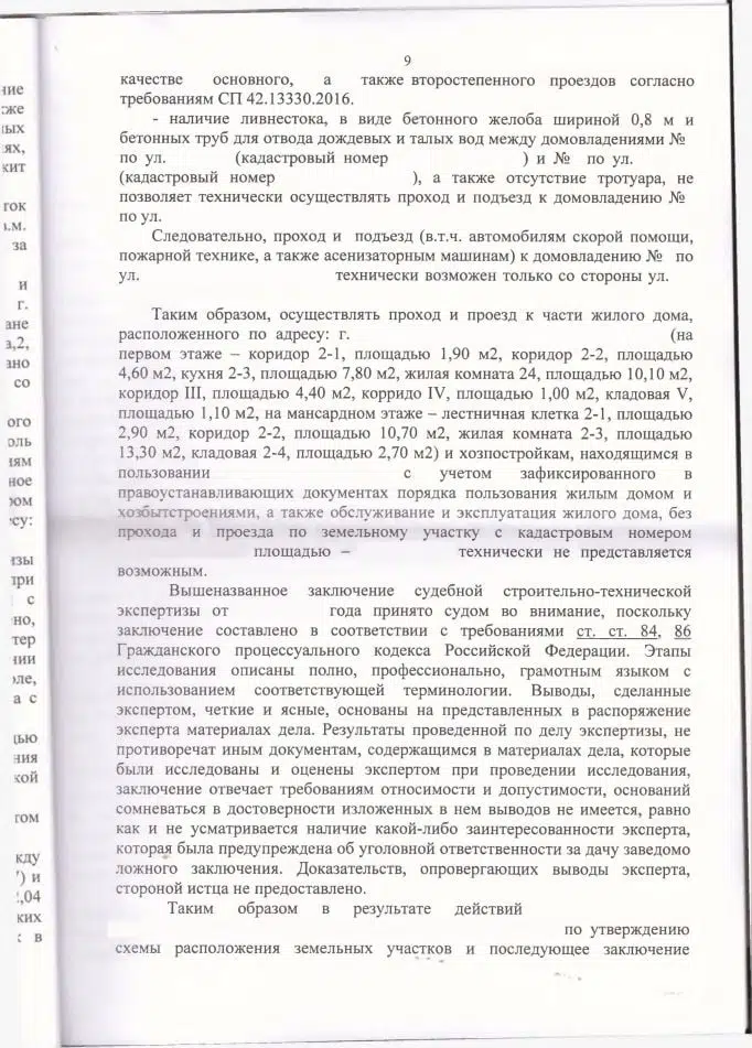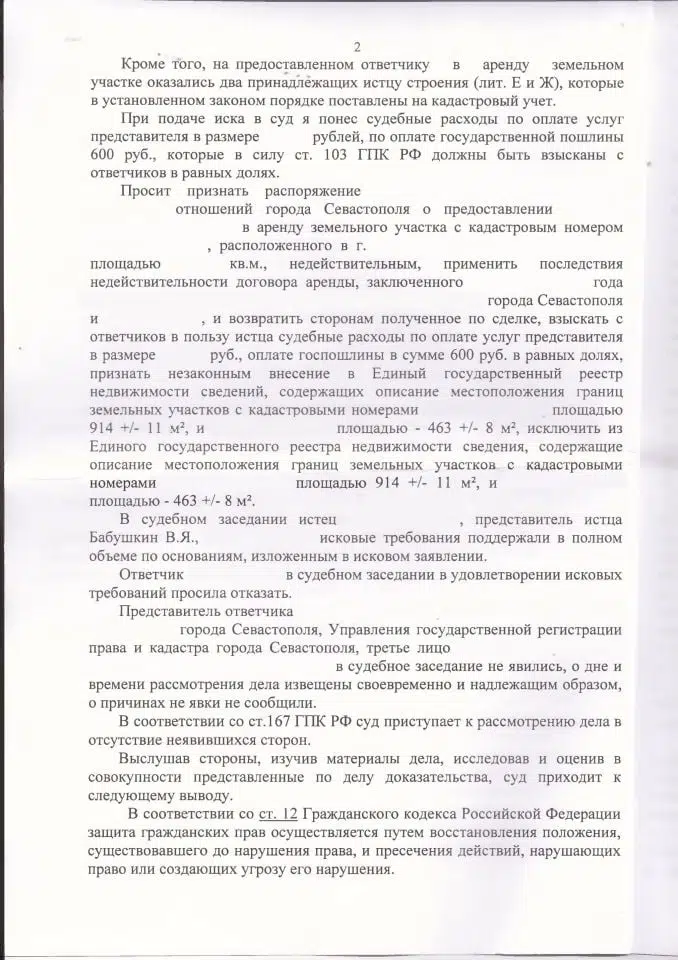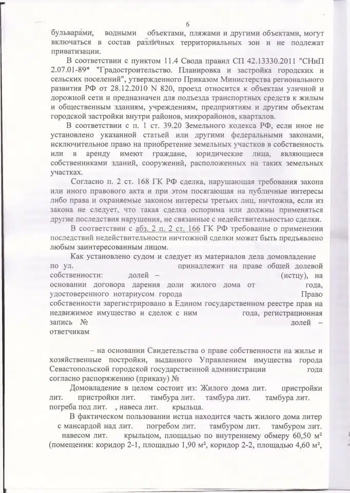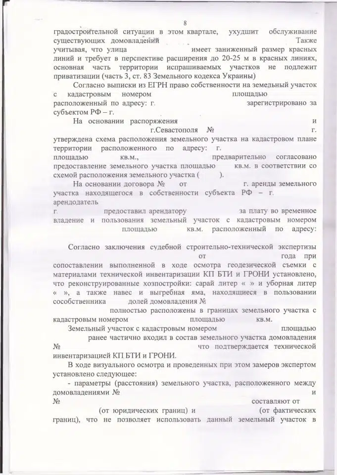 Мы подготовили исковое заявление в Ленинский районный суд города Севастополя на основании ст. 168 ГК РФ, ст. 11.9, 39.14, 39.15, 60, 85 Земельного кодекса РФ. По делу была проведена судебная строительно-техническая экспертиза, которая подтвердила, что проход и подъезд к части дома клиента (включая спецтехнику — скорую, пожарную, ассенизаторную) технически возможен только через арендованный участок, а параметры оставшегося пространства между домовладениями не соответствуют нормам СП 42.13330.2016. Экспертиза также установила, что хозпостройки клиента полностью расположены в границах арендованного участка.