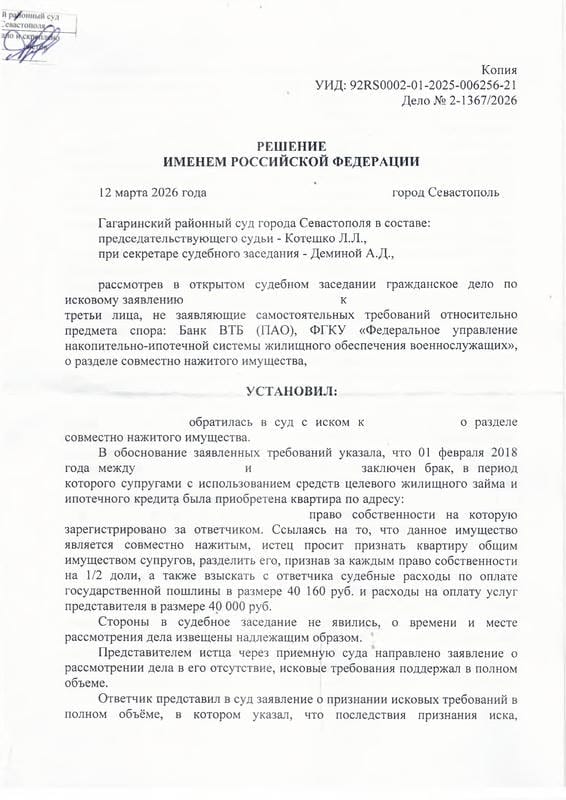 Клиентка обратилась за помощью в разделе квартиры в Севастополе, которую муж приобрёл в период брака по программе военной ипотеки. Квартира была оформлена только на супруга — участника накопительно-ипотечной системы (НИС). Муж настаивал, что жильё приобретено за счёт средств федерального бюджета и не подлежит разделу.