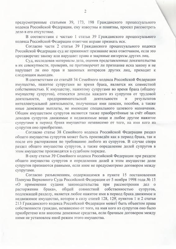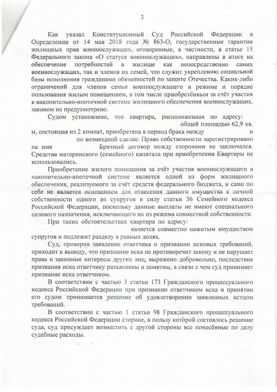Мы подготовили исковое заявление в Гагаринский районный суд Севастополя, опираясь на статью 34 Семейного кодекса РФ и Определение Конституционного суда РФ от 14 мая 2018 года № 863-О. В иске обосновали, что участие в НИС — это форма жилищного обеспечения военнослужащего и членов его семьи, а не целевая выплата с ограничениями по режиму собственности. Имущество приобретено в период брака по возмездной сделке, брачный договор отсутствует, средства материнского капитала не использовались. Цена иска — 2 516 000 руб. (половина стоимости квартиры 5 032 000 руб.), госпошлина — 40 160 руб. Ответчик в судебном заседании иск признал в полном объёме.