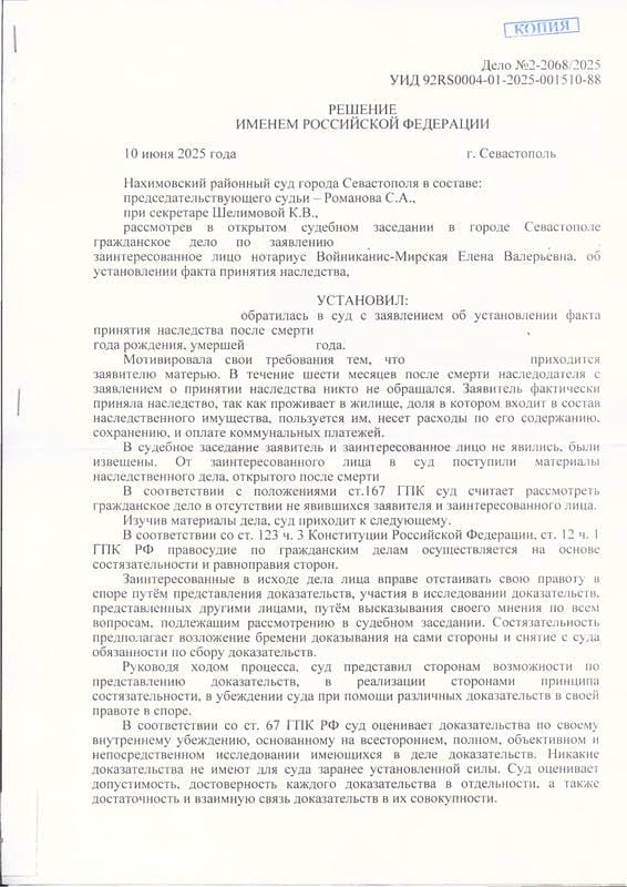Мы подготовили заявление об установлении факта принятия наследства на основании ч. 4 ст. 1153 ГК РФ и ст. 264 ГПК РФ и подали его в Нахимовский районный суд г. Севастополя. В качестве заинтересованного лица был привлечён нотариус, который предоставил в суд материалы наследственного дела. Доказательствами послужили свидетельство о рождении, выписка из ЕГРН, квитанции об оплате коммунальных услуг по обеим квартирам.