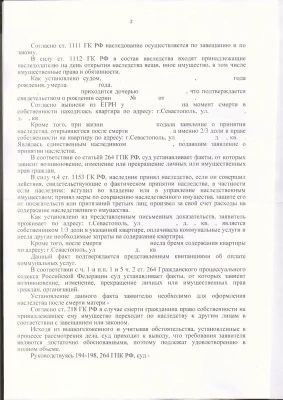 Результат: Нахимовский районный суд г. Севастополя удовлетворил заявление и установил факт принятия наследства, что позволяет клиенту оформить право собственности на наследственное имущество — квартиру и 2/3 доли в другой квартире.