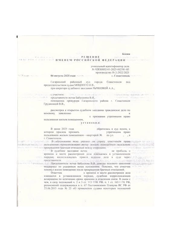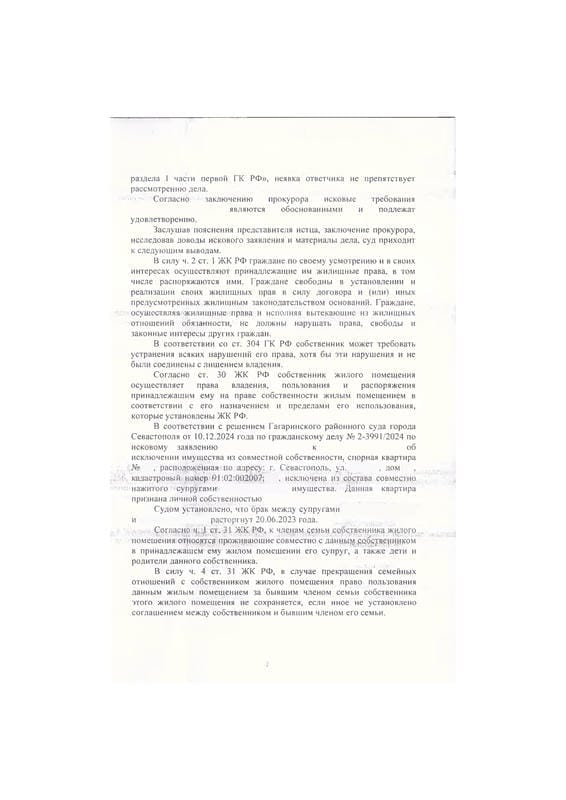 Клиентка обратилась за помощью после расторжения брака. Ранее, в декабре 2024 года, Гагаринский районный суд Севастополя по делу №2-3991/2024 признал квартиру на ул. Репина личной собственностью клиентки, исключив её из состава совместно нажитого имущества. Бывший муж добровольно выехал из квартиры и вывез свои вещи, однако отказался сниматься с регистрационного учёта.