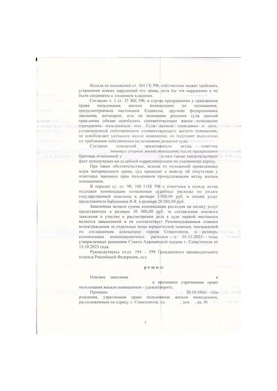 Мы подготовили исковое заявление в Гагаринский районный суд Севастополя на основании ст. 209, 304 ГК РФ и ст. 30, 31, 35 ЖК РФ. В обоснование требований сослались на вступившее в силу решение суда о признании квартиры личной собственностью истицы и на прекращение семейных отношений. К делу была привлечена прокуратура Гагаринского района, помощник прокурора дал заключение об обоснованности иска. Ответчик в судебное заседание не явился, корреспонденция возвращена за истечением срока хранения.