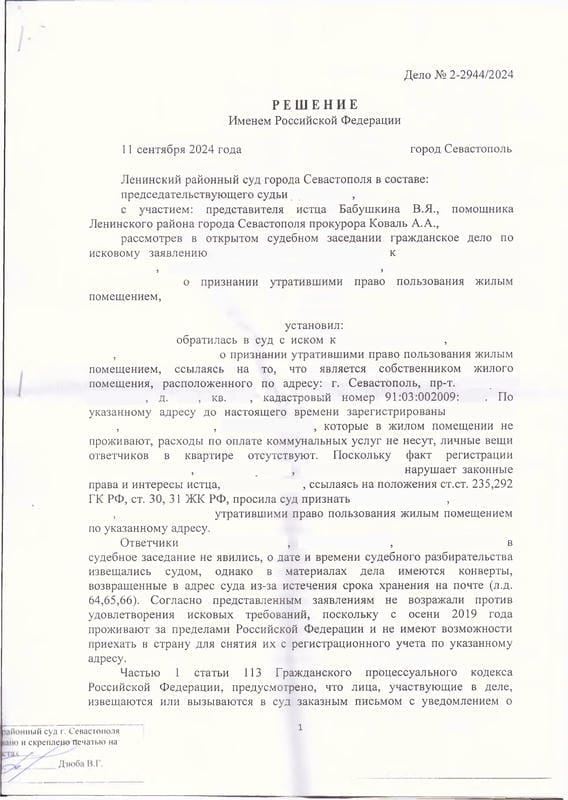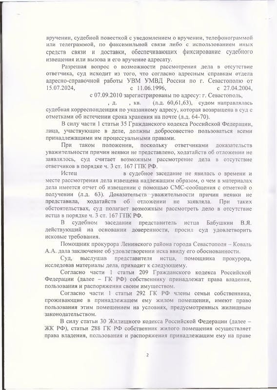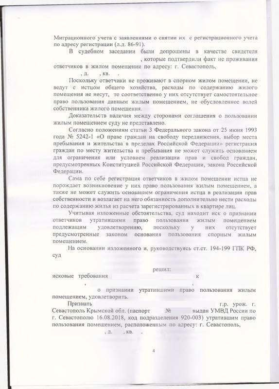 Мы подготовили исковое заявление в Ленинский районный суд Севастополя на основании ст. 209, 292, 304 ГК РФ и ст. 30, 31 ЖК РФ. К делу были привлечены прокуратура Ленинского района и Управление по вопросам миграции УМВД. Ответчики направили в суд заявления о том, что не возражают против удовлетворения иска. В судебном заседании были допрошены свидетели, подтвердившие факт непроживания ответчиков. Помощник прокурора дал заключение об обоснованности требований.