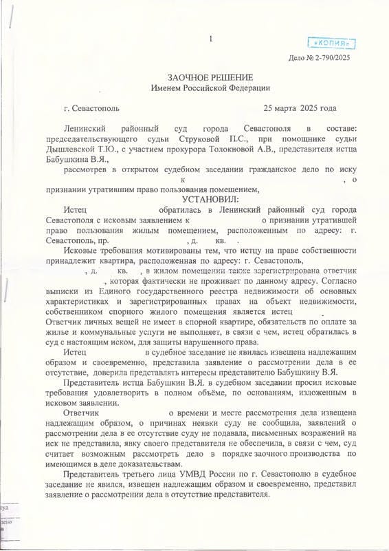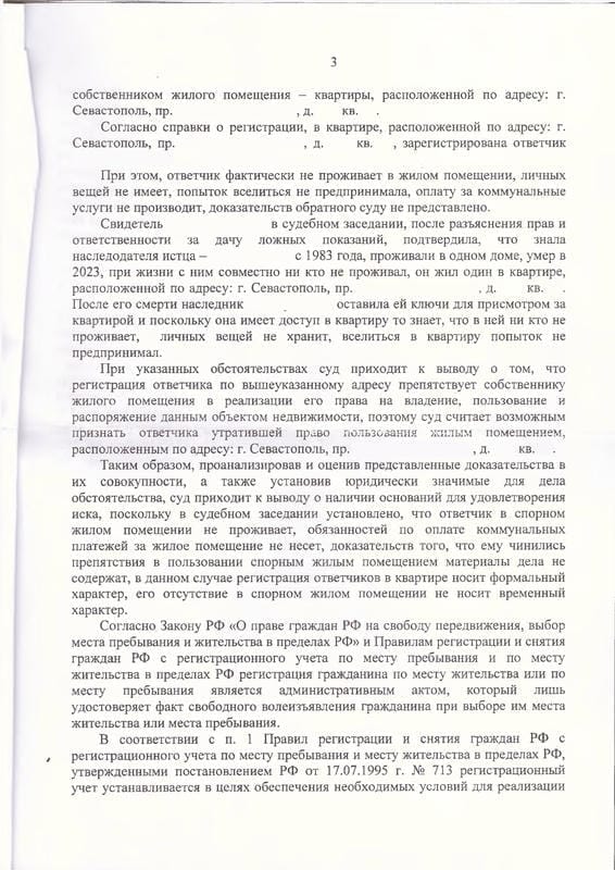Мы подготовили исковое заявление в Ленинский районный суд Севастополя на основании ст. 209, 304 ГК РФ и ст. 30, 35 ЖК РФ. К делу были привлечены УМВД России по г. Севастополю и прокуратура. В судебном заседании был допрошен свидетель — соседка наследодателя, которая подтвердила, что ответчица не проживала в квартире. Помощник прокурора дал заключение об обоснованности иска. Дело рассмотрено заочно.