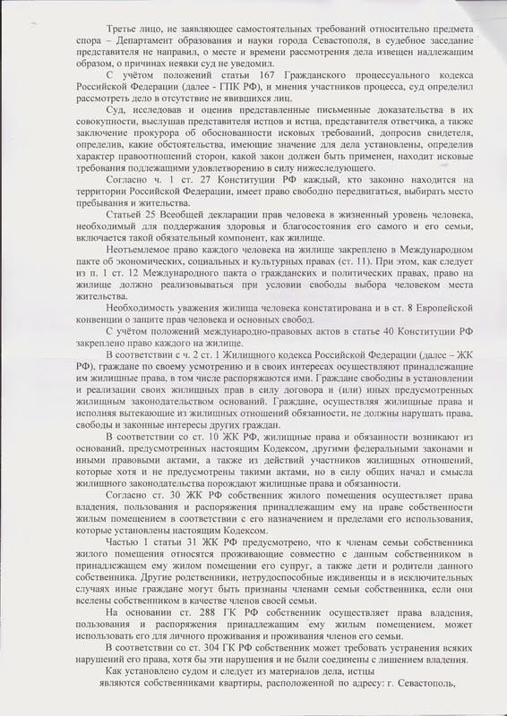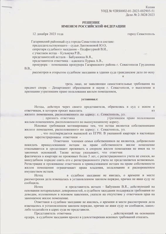 Мы подготовили исковое заявление в Гагаринский районный суд Севастополя на основании ст. 30, 31, 35 ЖК РФ и ст. 288, 304 ГК РФ с требованиями о выселении проживающих ответчиков и признании выехавшего ответчика утратившим право пользования жилым помещением. К участию в деле были привлечены Департамент образования и науки г. Севастополя (в связи с наличием несовершеннолетнего ребёнка) и прокурор Гагаринского района. Не явившимся ответчикам суд назначил адвоката, который просил отказать в иске. В ходе процесса были допрошены свидетели, прокурор дал заключение об обоснованности исковых требований. Суд установил, что законных оснований для сохранения за ответчиками права пользования квартирой не имеется, и удовлетворил иск в полном объёме.