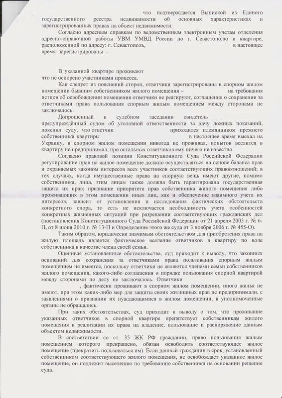 Клиенты унаследовали квартиру на ул. Астана Кесаева в Гагаринском районе Севастополя после смерти отца. В квартире оставались проживать и были зарегистрированы: сожительница отца (в официальном браке они не состояли), её дочь с несовершеннолетним сыном, а также знакомый наследодателя, который фактически выехал на Украину более 5 лет назад, но с регистрационного учёта не снялся. Ответчики не являлись членами семьи новых собственников, соглашения о праве пользования квартирой не заключалось. Добровольно освобождать жилое помещение ответчики отказались.