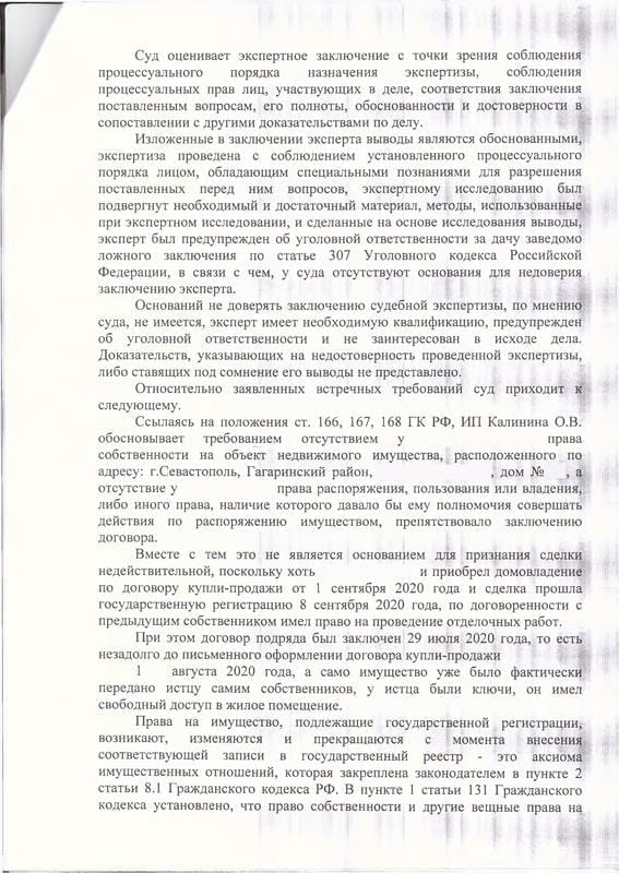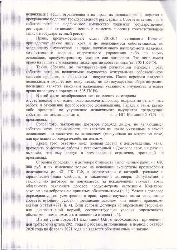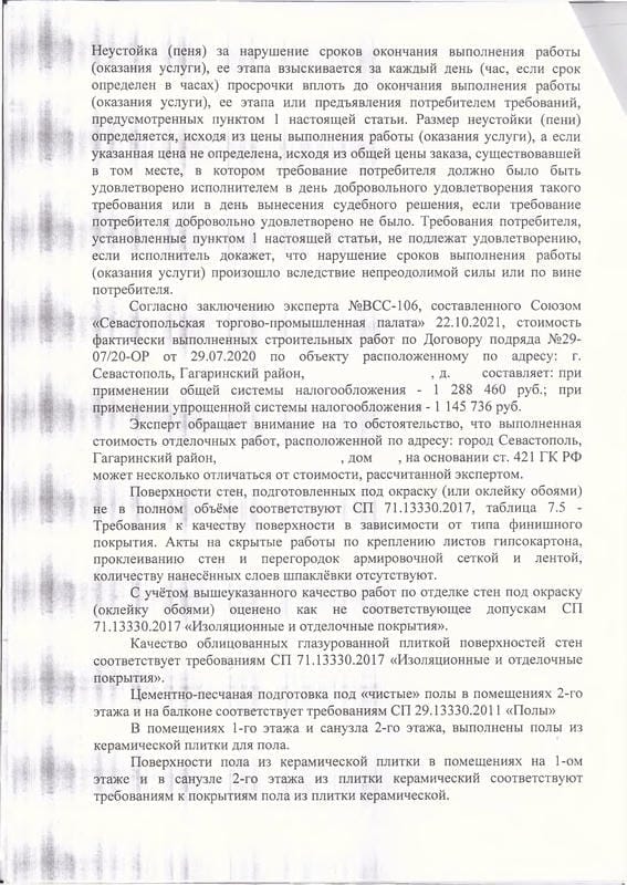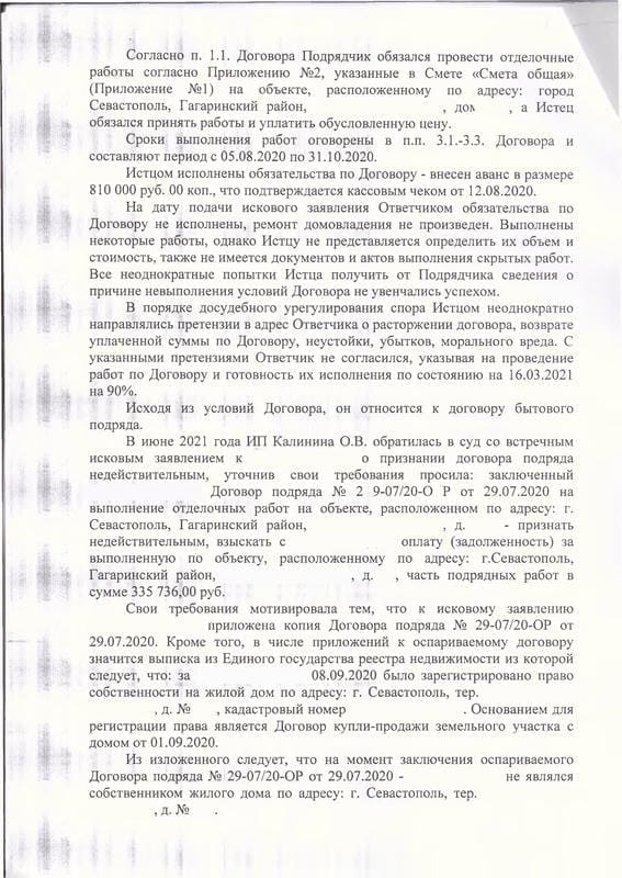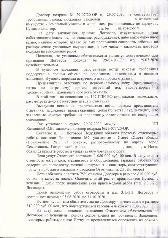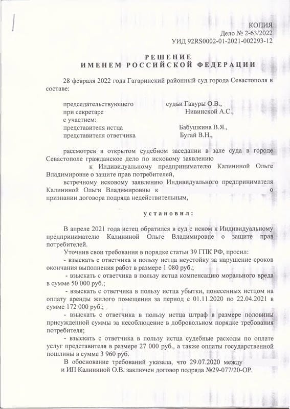 Мы направили досудебную претензию с требованием о расторжении договора и подготовили исковое заявление в Гагаринский районный суд Севастополя на основании Закона о защите прав потребителей. В обоснование требований рассчитали неустойку по п. 5 ст. 28 ЗоЗПП, заявили убытки в виде арендных платежей за период с 01.11.2020 по 22.04.2021 (172 000 руб.) и компенсацию морального вреда. ИП Калинина О.В. подала встречный иск — потребовала признать договор подряда недействительным на том основании, что на момент заключения договора клиент ещё не был зарегистрирован как собственник дома. Суд отклонил этот довод, указав, что клиент являлся законным владельцем имущества на основании ст. 305 ГК РФ. По делу была проведена судебная экспертиза Союзом «Севастопольская торгово-промышленная палата», которая подтвердила существенные недостатки работ.