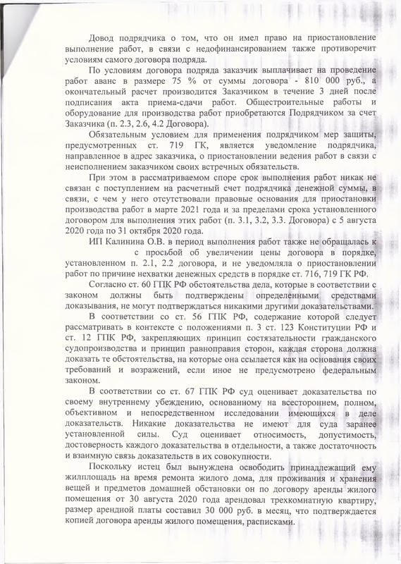 Клиент заключил с ИП Калининой О.В. договор бытового подряда на отделочные работы в жилом доме в Гагаринском районе Севастополя. Стоимость работ составила 1 080 000 руб., аванс 810 000 руб. был оплачен в полном объёме. Срок выполнения работ — с 05.08.2020 по 31.10.2020. Подрядчик нарушил сроки, работы не были завершены, акты на скрытые работы не оформлены, качество значительной части работ не соответствовало нормативам СП 71.13330.2017. Клиент был вынужден арендовать квартиру за 30 000 руб. в месяц на время ремонта.