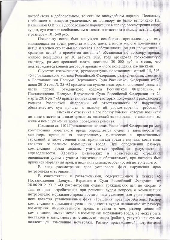 Результат: Суд полностью удовлетворил иск и взыскал с ИП Калининой О.В.: убытки за аренду жилья — 172 000 руб., штраф за несоблюдение требований потребителя — 101 540 руб., компенсацию морального вреда — 30 000 руб., неустойку — 1 080 руб., расходы на представителя — 27 000 руб., госпошлину — 3 960 руб. Во встречном иске о признании договора недействительным отказано.