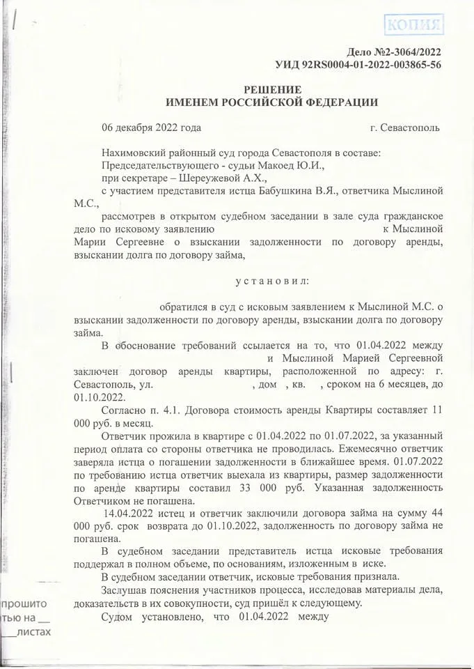 Скачать: Копия решения Нахимовского районного суда о взыскании задолженности по договорам аренды и займа