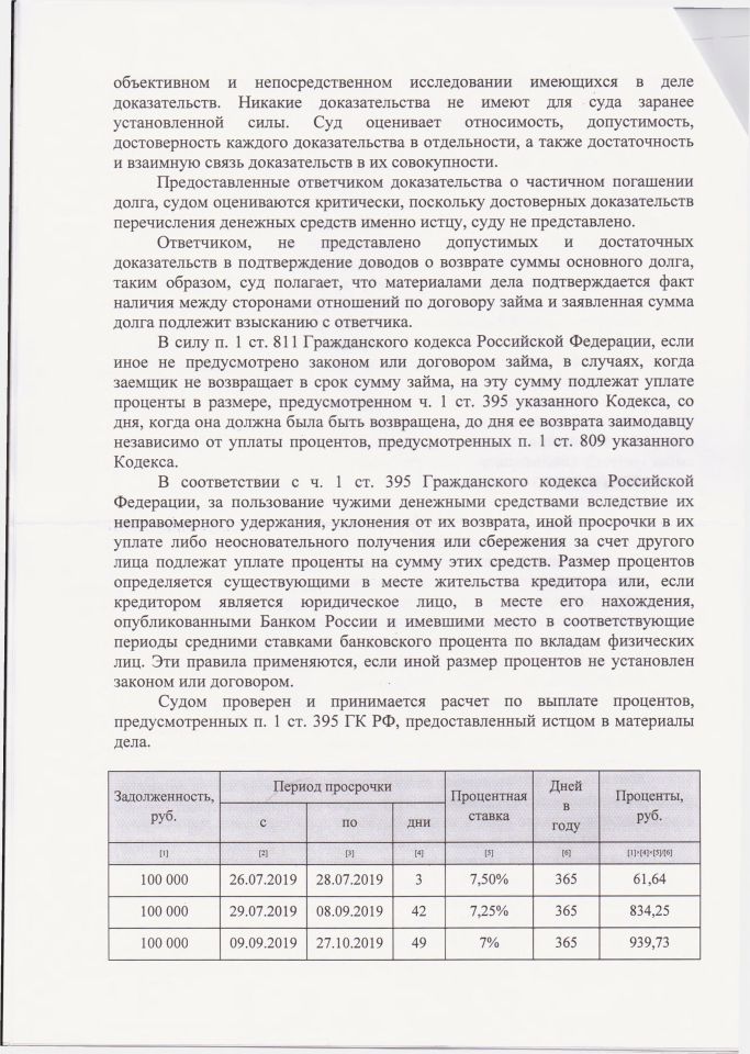Оказанные услуги: Изучение документов, досудебная претензия, расчёт процентов, составление и подача искового заявления, участие в судебном процессе