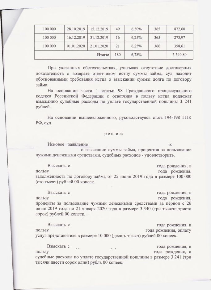 Результат: Суд взыскал с должника: сумму займа — 100 000 руб., проценты за пользование чужими денежными средствами — 3 340 руб., расходы на представителя — 10 000 руб., госпошлину — 3 241 руб. Итого около 116 600 руб.