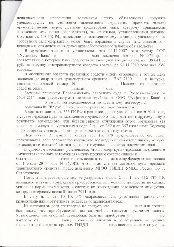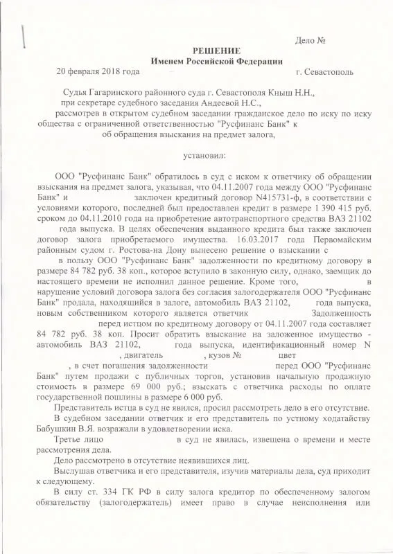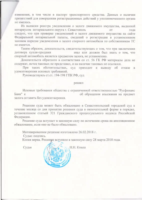 Результат: Гагаринский районный суд города Севастополя отказал ООО «Русфинанс Банк» в обращении взыскания на автомобиль, признав клиента добросовестным приобретателем. Решение вступило в законную силу 28 марта 2018 года.